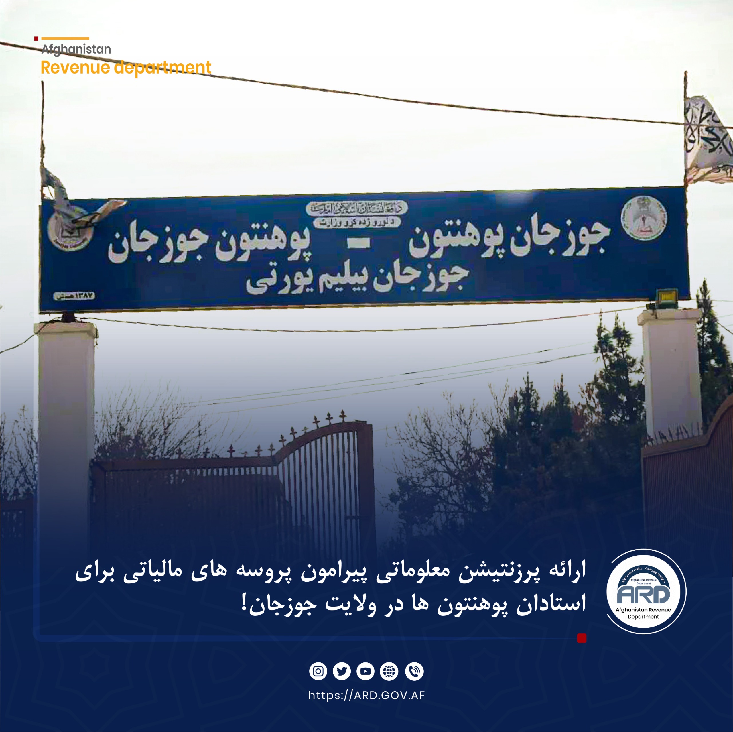 به ابتکار ریاست عمومی عواید وزارت مالیه، یک پرزنتیشن معلوماتی در مورد نظام مالیاتی افغانستان برای استادان پوهنتون جوزجان و همچنان استادان پوهنتون های خصوصی این ولایت برگزار گردید.